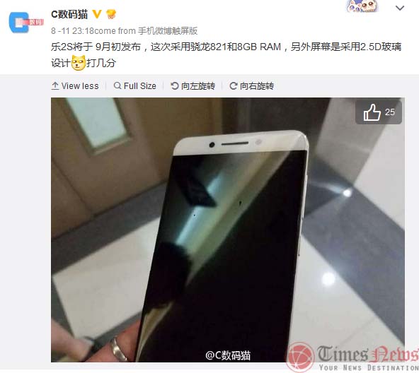 The LeEco Le 2S will also be the second smartphone to be powered by the latest Snapdragon 821 SoC, as Asus has already launched a SD821 powered smartphone in the past months. This new device with 8GB of RAM is also rumored to launch in early September if we believe the leak by a weibo user. The weibo user also shared an image from the device that show the upper front part of this unannounced device. With 8GB RAM and the SD821 SoC, it will be a powerful device and will also be costly compared to other LeEco devices launched in the past.