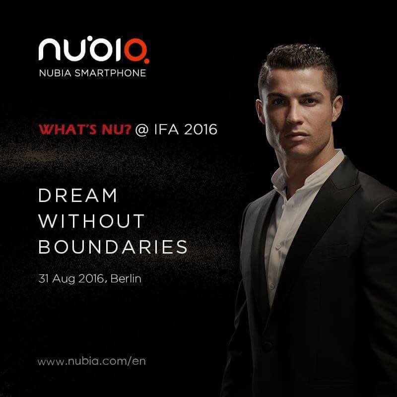 ZTE’s Nubia division has announced today that it will launch a new smartphone on 31st August at IFA 2016 event in Berlin. The company, however, hasn’t posted any details about the device. The company has shared some teasers on Twitter and Facebook accounts that features their global brand ambassador Cristiano Ronaldo in one teaser and the company has also launched a teaser page on their official website for this smartphone launch. The teaser reads ‘Dream Without Boundaries’ that hints towards a bezel-less device and further it comes with the launch event date at IFA 2016.