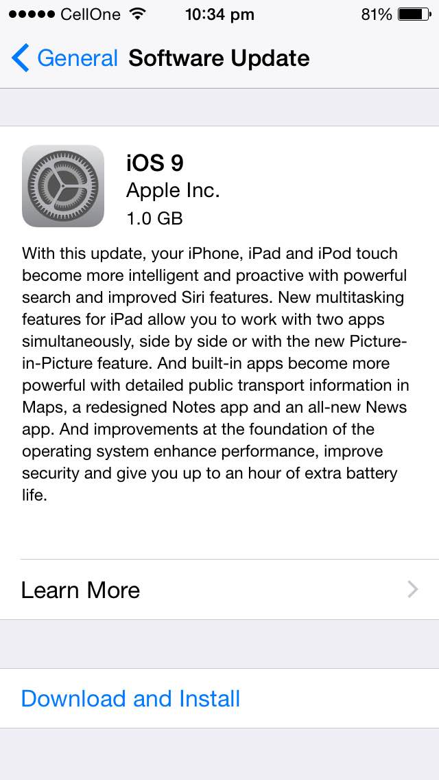 You will receive the notification of the update, if you haven’t got the notification yet, go to Settings > General > Software Update option to download and install the iOS9 update to your Apple device. The update size is of 1 GB in size.