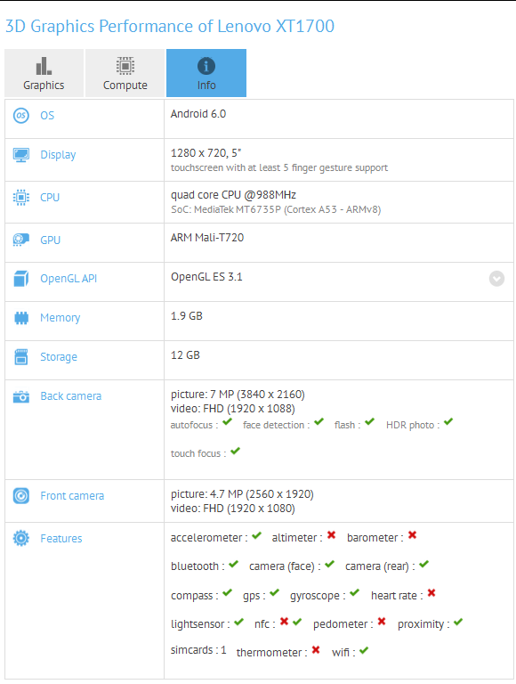 The GFXBench listings for the both Lenovo XT1700 and Lenovo XT1706 confirms that this new Motorola device will have a 5-inch HD display with 1280 x 720 pixel resolution and will be powered by the MediaTek processor that is a quad core 988MHz MediaTek MT6735P (Cortex A53 – ARMv8) processor with ARM Mali-T720 GPU. It has 2GB of RAM 16GB of inbuilt storage and runs on the Android 6.0 Marshmallow OS out of the box.