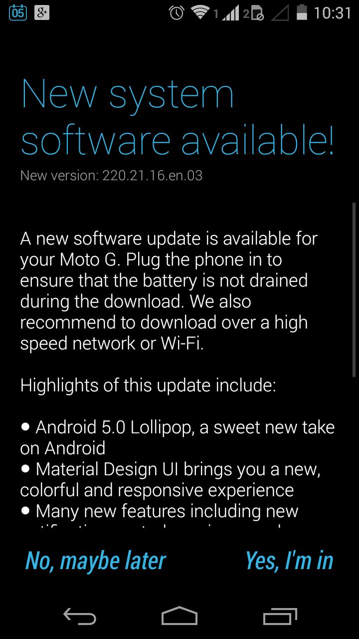 The new Lollipop update brings new features and new look for Android and Moto G. Notifications UI has been changed, New Interruptions & Downtime Settings has arrived, Flashlight, recent apps etc are added features in this update. Full features are already listed by Motorola on changelog page.