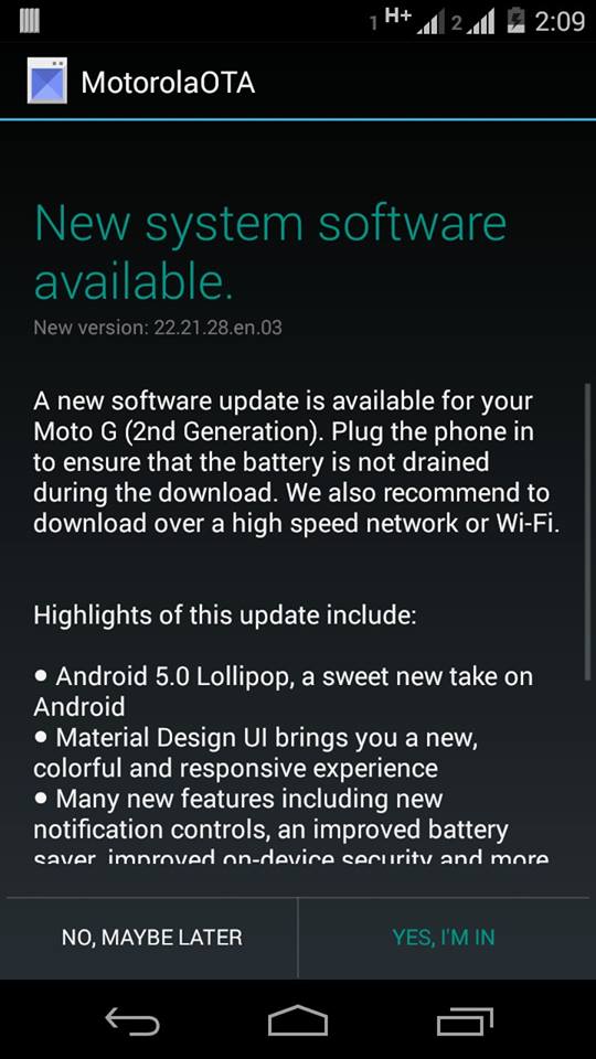 Motorola posted as “Lollipop is rolling out in phases to MotoG (2nd Gen) in US & Moto G (1st & 2nd Gen) in India. Look for the notification on your device!”