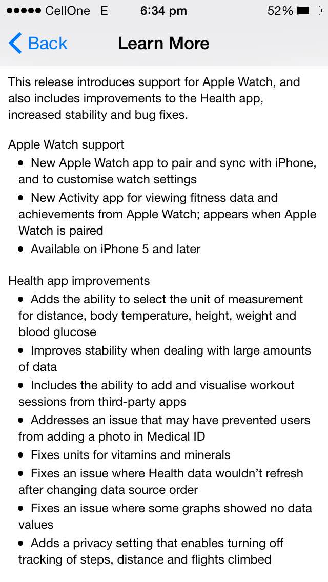 According to Apple, iOS 8.2 includes Apple watch support, Health app improvements, Stability enhancements and bug fixes. If you haven’t received the notification, just check by going to Settings>>General>>Software Update. You can also update via iTunes to iOS 8.2.