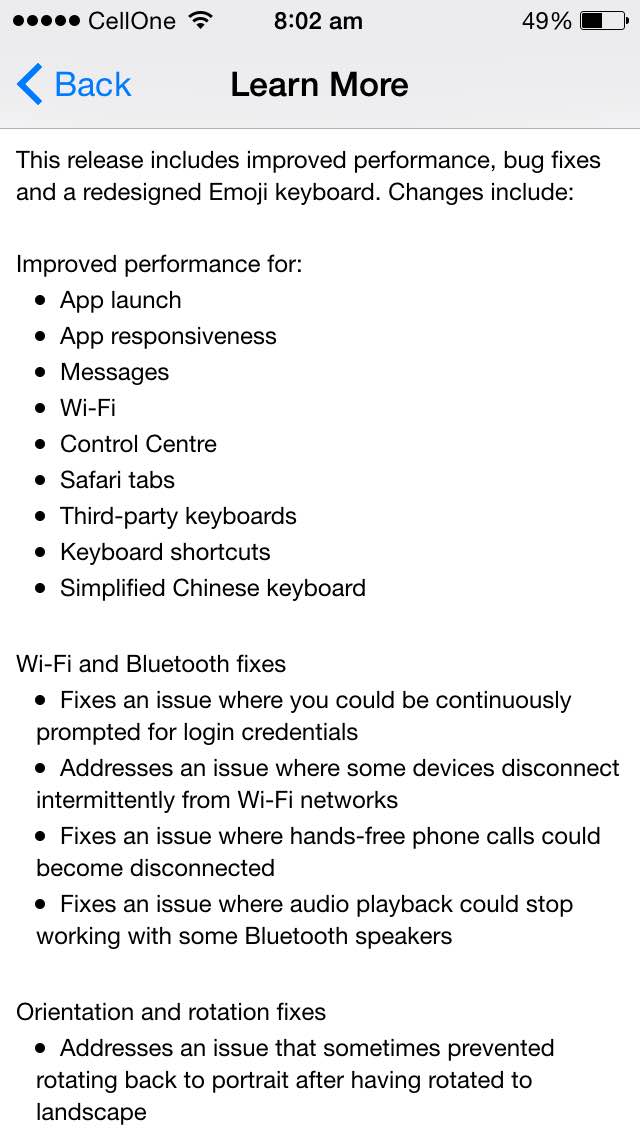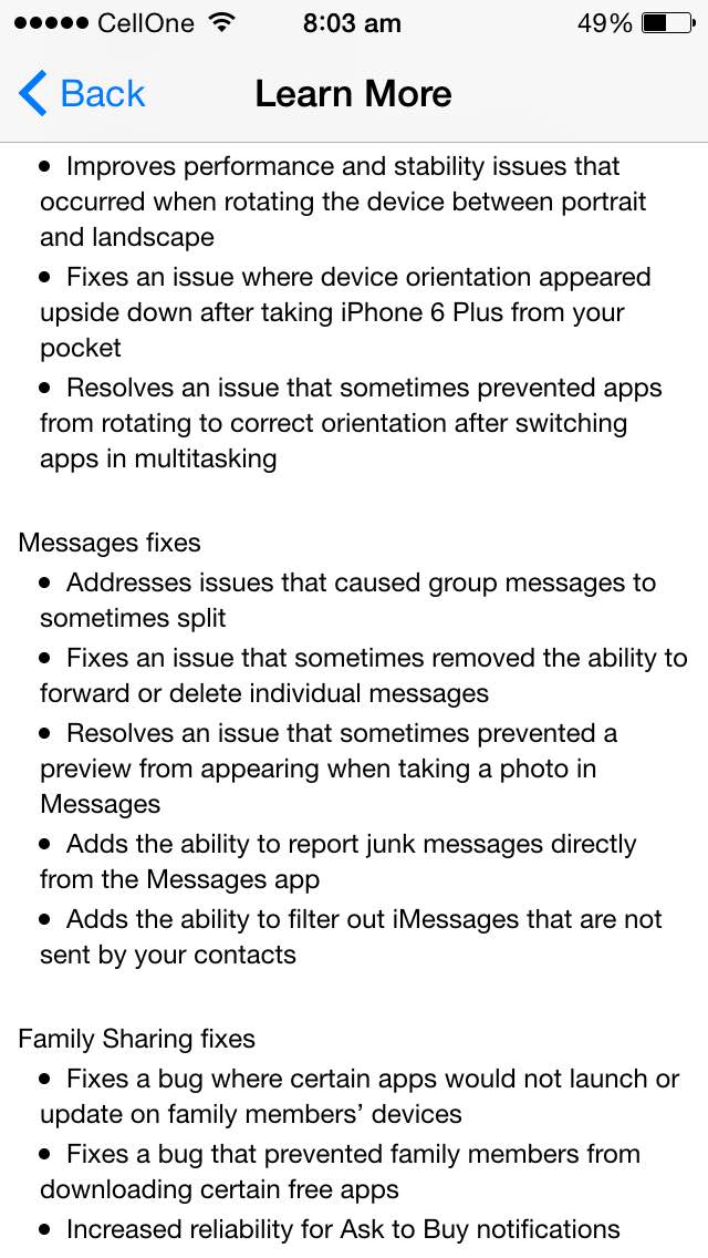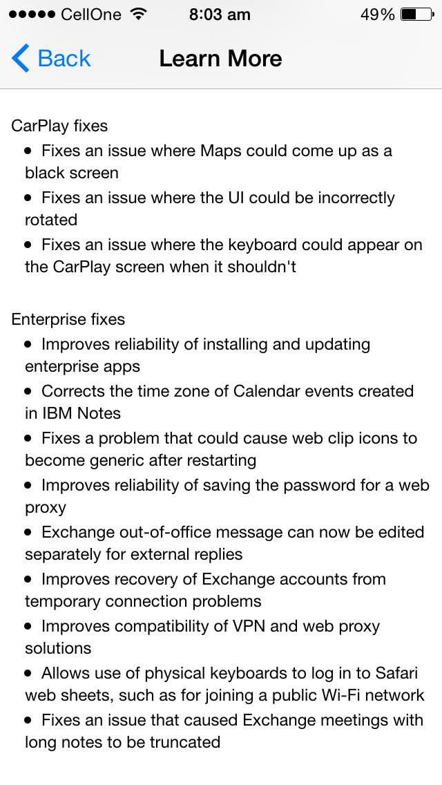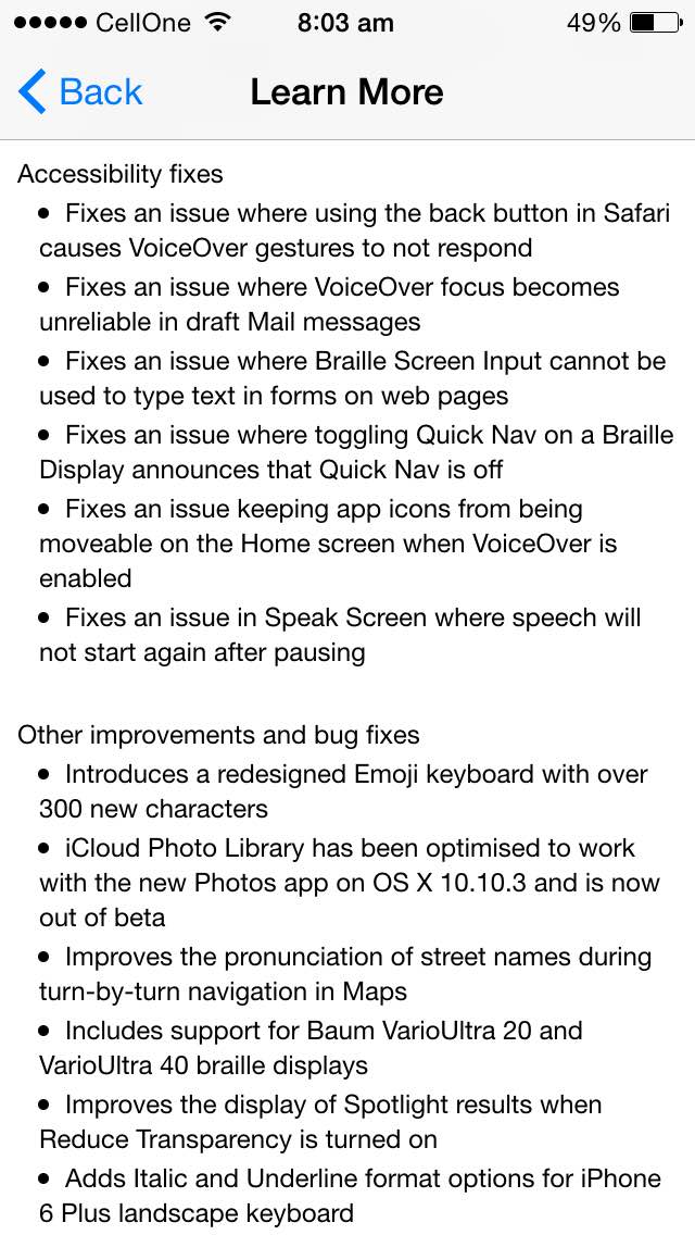 Other improvements includes Wireless Carplay, pronunciation of street names during turn by turn navigation in maps, support for Baum VarioUltra 20 and VarioUltra 40 braille displays, italic and underline format options for iPhone 6 Plus landscape keyboard, improve display spotlight results, Apple Pay improvements, New languages and country support in Siri and many other fixes.
