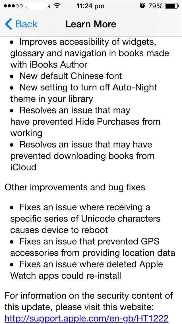 Bug fixes includes fixing an issue where receiving a specific series of Unicode characters causes device to reboot, GPS bug fix, a bug where deleted apple watch apps could re-install. Another change I have noticed that now you can delete any song from music library which was not possible in previous iOS versions.