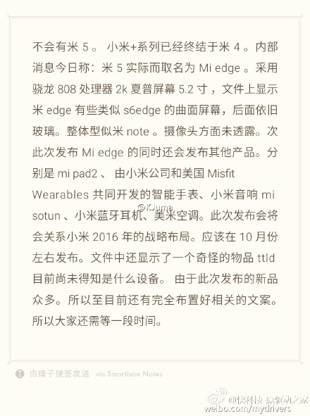 The leak also says that Xiaomi will launch Mi 2 tablet, smart watches, Bluetooth headsets in October along with Xiaomi Mi Edge.