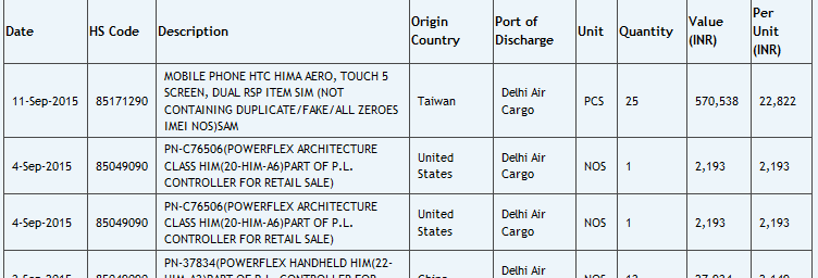 Zauba listing of HTC Hima Aero suggests that it will have 5 inch display which was rumored to be QHD display with 2560×1440 pixels resolution and Dual SIM support is also confirmed. Looks like the device imported for R&D testing purposes as it shows fake/all zeroes IMEI numbers.
