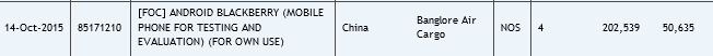 The Indian import/export data website Zauba has listed a new Android Blackberry smartphone in its database, which is without any doubt, the new Blackberry Priv and is imported to India from China. There are 4 units of Blackberry Priv imported to India on 14th of October with each unit priced at INR 50,635 (around $780) which looks cheaper from the UK price by nearly 8k-9k Rupees.