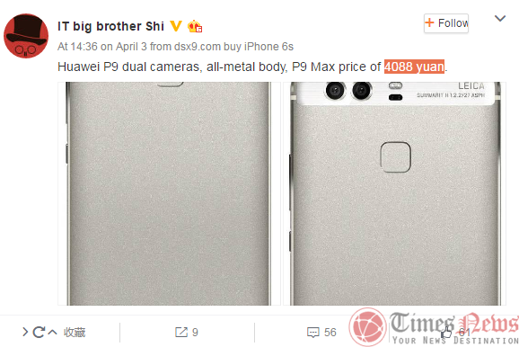 Huawei P9 features a real camera of 12-megapixel and an 8-megapixel front facing camera. The device comes with features like Bluetooth, NFC, WiFi, GPS and single SIM support. No other details have been available in the GFXBench listing. The weibo post confirms that the Huawei P9 will have full metal body and will have a variant called Huawei P9 Max that will cost 4088 yuan (around $631). The user also posted the back panel images of the device.