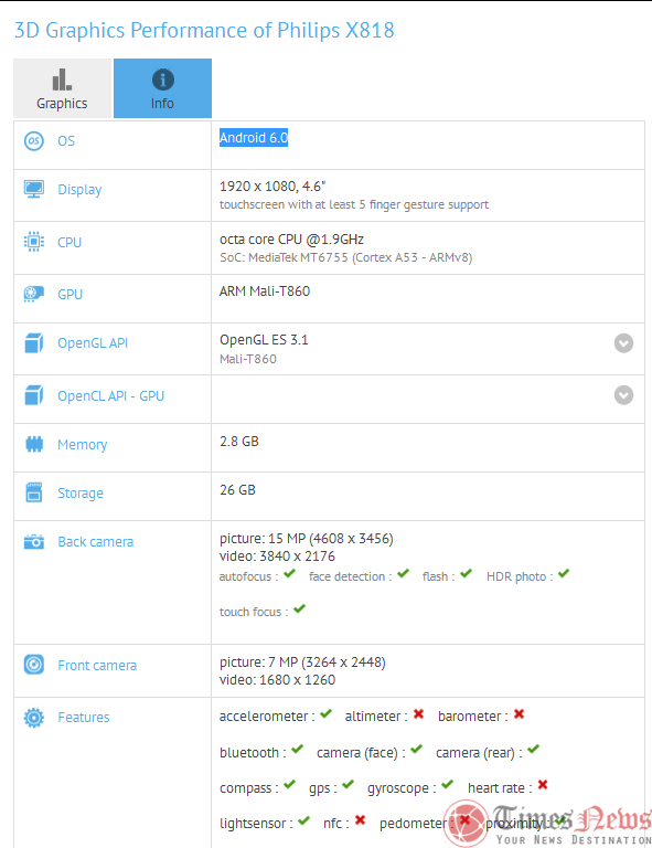 The GFXbench listing for the Philips X818 shows that this upcoming new phone will have a 4.6-inch Full HD display with 1920 x 1080 pixel resolution and will be powered by the octa-core 1.9GHz MediaTek MT6755 (Cortex A53 – ARMv8) processor along with the ARM Mali-T860 GPU. THis smartphone comes with 3GB of RAM and 32GB inbuilt storage capacity as well. This new device runs on the latest Android 6.0 Marshmallow out of the box as per the GFXBench listing.
