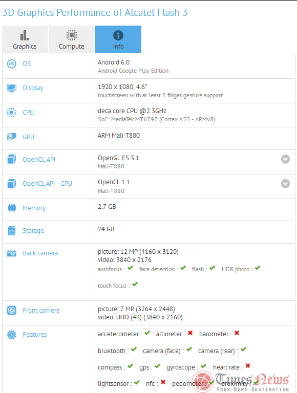 The GFXBench listing for Alcatel Flash 3 shows that it will have a 4.6-inch full HD display with 1920 x 1080 pixels resolution. There might be an error in the GFXBench listing as the Alcatel Flash 2 was having a 5-inch display and we can expect the same or bigger display in the Flash 3. The Alcatel Flash 3 is powered by a deca-core 2.3GHz MediaTek Helio X20 MT6797 (Cortex A53 – ARMv8) processor that also comes with ARM Mali-T880 GPU.